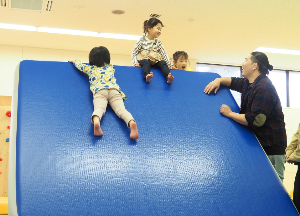 屋外で活動する方があまり見られない中、キッズスペースでは、大きな滑り台やトランポリンで元気いっぱいに遊ぶ子どもたちの姿が見られました。