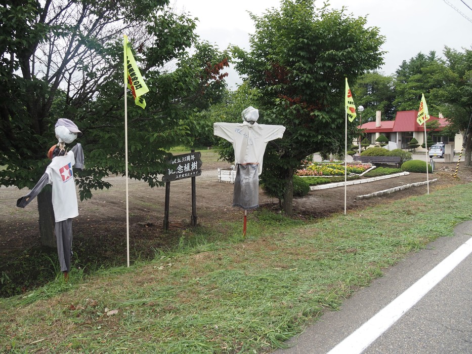 こちらの道路脇には手作りのかかしが立てられており、道行く車を見守っています。