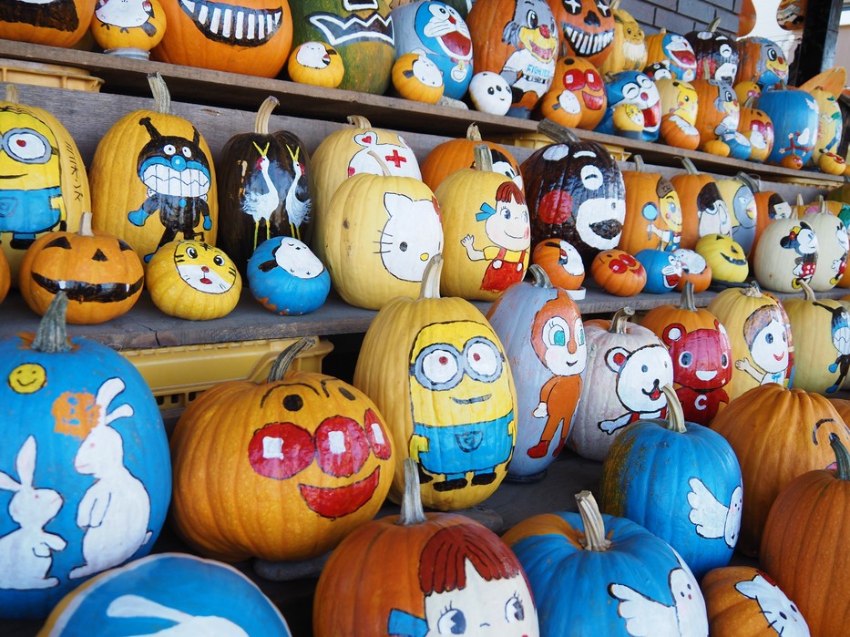 錦町児童公園近くの志村さんのお宅前に、かわいいキャラクターが描かれたかぼちゃが並んでいます。