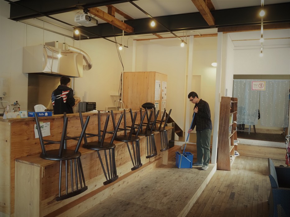 今日は本通2丁目にあるゆないとべーすにお邪魔したところ、9時30分からのオープンに向け、職場実習生の2人が清掃作業をしていました。