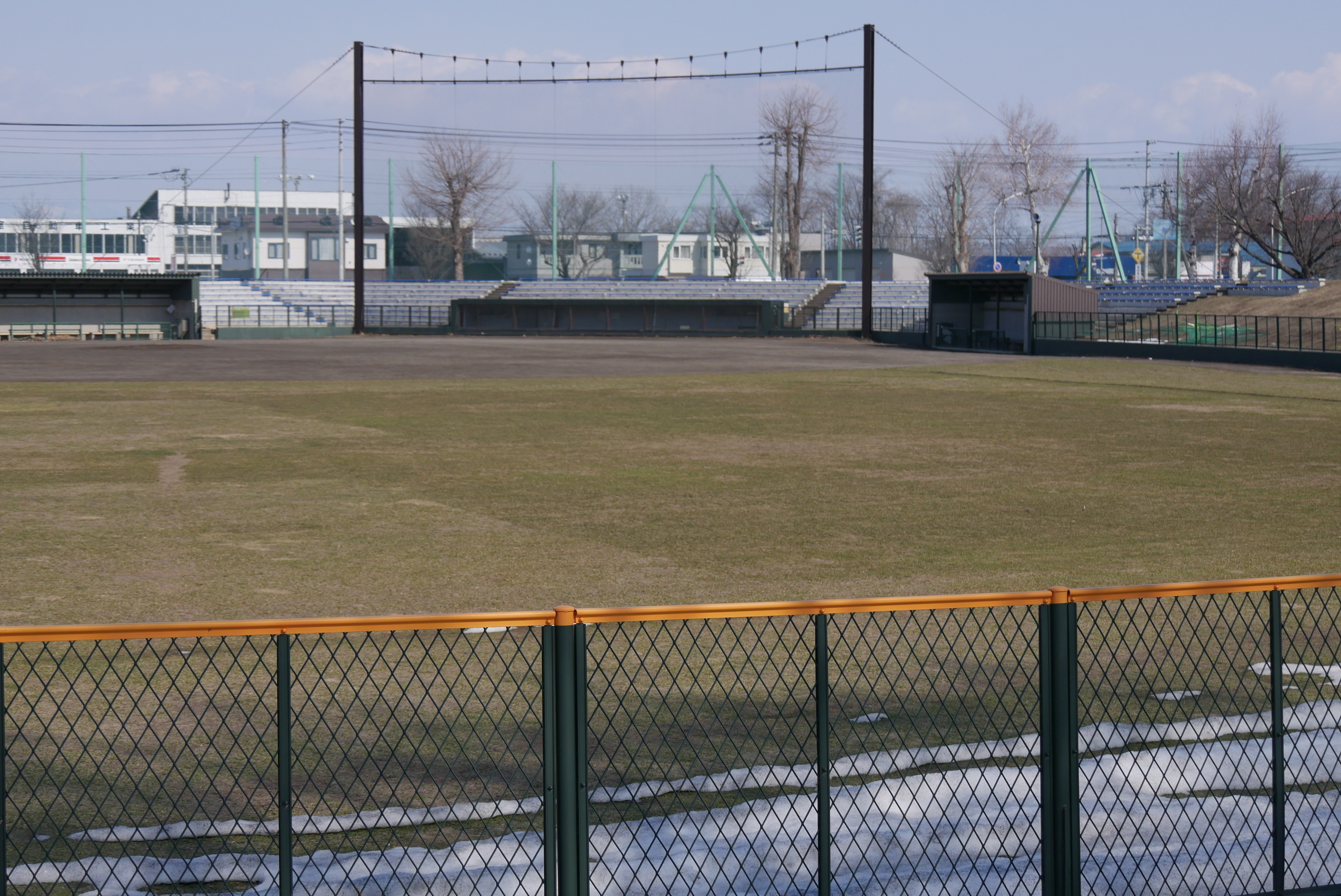 野球場もフェンス際の日かげは雪が残ってましたが、日当たりのいいところは溶けてました。