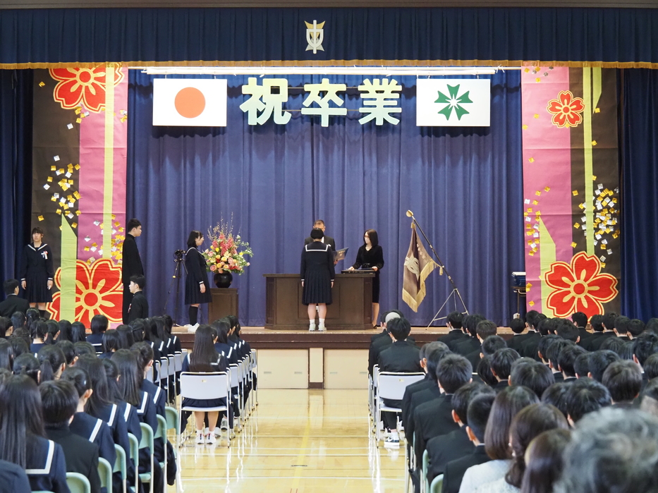 卒業証書授与、在校生からの別れの言葉や卒業生へ贈る合唱、そして卒業生からの答辞と合唱、最後に全校生徒で「旅立ちの日に」を合唱するなど、涙の溢れる感動の卒業式となりました。