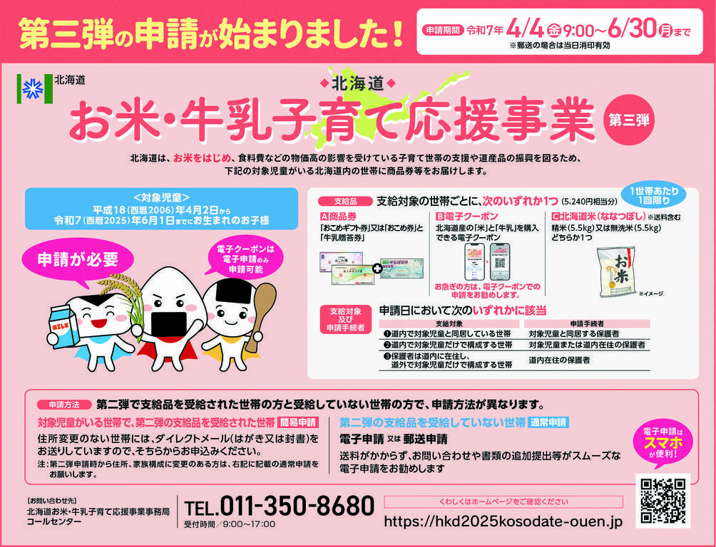 北海道では、お米をはじめ、食料費などの物価高の影響を受けている子育て世帯の支援や道産品の振興を図るため、平成18(2006)年4月2日から令和7(2025)年6月1日までにお生まれの子ども(対象児童)がいる北海道内の子育て世帯に対して、商品券などをお届けします。