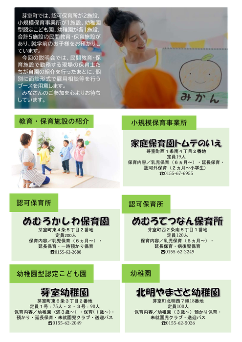 芽室町では、保育士・幼稚園教諭資格をお持ちの方、または取得見込みの方を対象に、町内の法人教育・保育施設の就職説明会を実施しています。(令和7年度:6月12日(木)、令和6年度:8月17日(土)、令和5年度:9月20日(水))