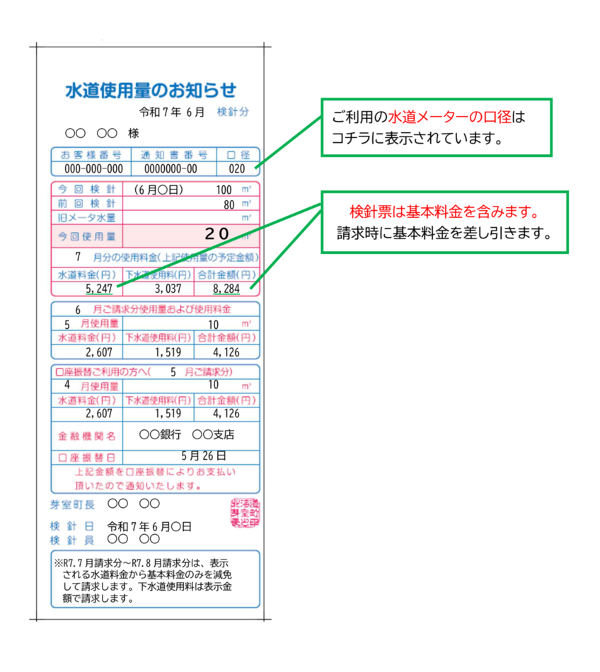 システムの都合上、水道検針時に投函している「水道使用量のお知らせ(検針票)」には基本料金を含む料金が表示されますが、請求時に基本料金を差し引いた金額で請求します。