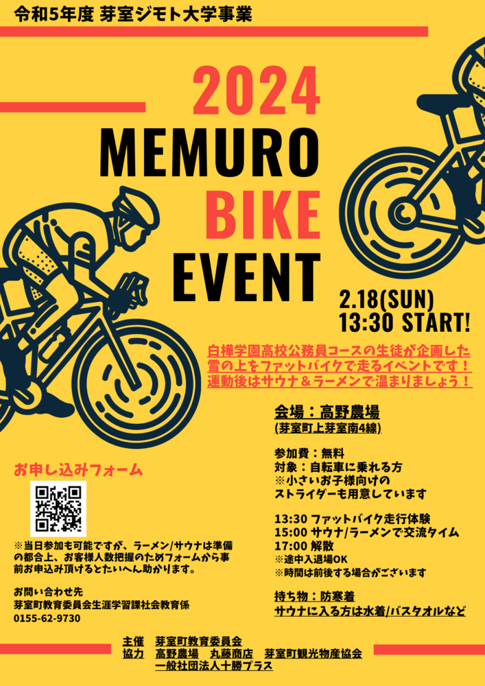 この企画は白樺学園高校公務員コースの2年生の生徒が、芽室町のアクティビティに関心を持ち、町内でイベントができないかを考え、実際に授業内で準備を進めてきたものになります。高校生が地域の大人といろいろと話してみたいという想いもありますので、ぜひお誘い合わせの上ご参加ください!