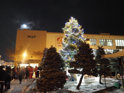 駅前のツリーに飾られたイルミネーションが点灯し、クリスマスムードが一気に高まりました。また、ツリー周辺には、園児のイラストが描かれたランタンが置かれ、光輝くツリーに花を添えました。