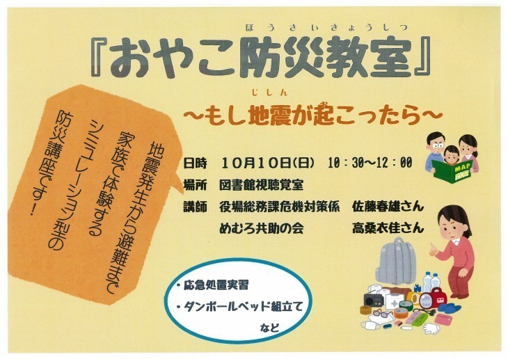 10月10日(日)に町図書館で『おやこ防災教室』を開催します!