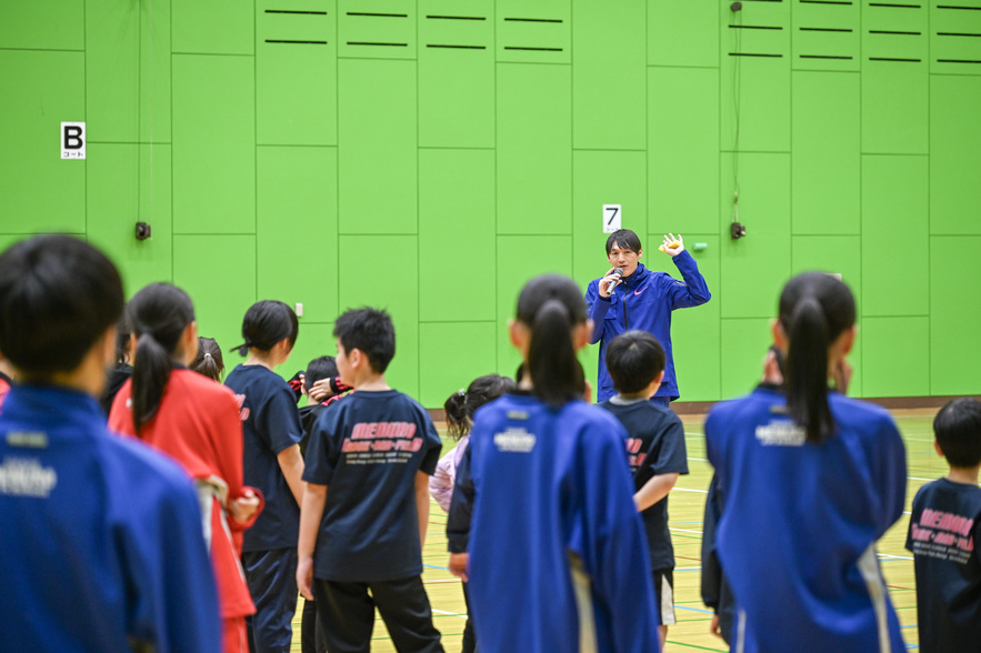陸上少年団や部活生の小中学生73人が参加し、走るときの目線や姿勢、腕振り、足を下す場所についての意識を教わりました。「思った通り身体を動かせることが大事」「何のためにウォーミングアップをするのか」「動きが良い形になっているのか」など、普段あまり考えていないテーマについてお話をいただき、参加した子ども達にとって大きな学びになったようです。