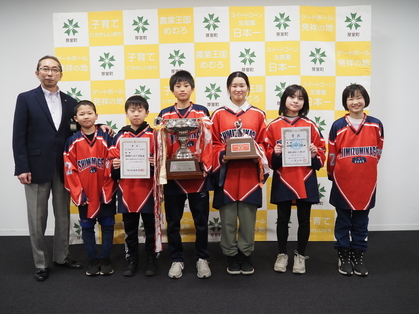 選手たちは「いつもと違う緊張感があり、どれも厳しい戦いだったが、みんなで力を合わせることで優勝することができた。応援してくださった地元の皆さんありがとうございました」とあいさつ。程野教育長は「新聞にも大きく掲載されて感動した。有言実行できたのはすばらしい。優勝を誇りに、次のステップに上がってほしい」と祝福しました。