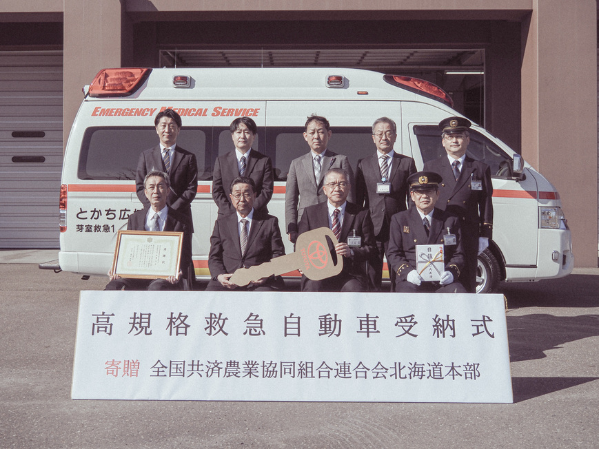 JA共済連様では安全で豊かな地域社会づくりと交通事故防止の一環として、昭和50年から200台以上の救急車を各地の消防本部に寄贈されてきました。この度の芽室消防署への寄贈は218台目で、最新の装備により安定した走行を実現。傷病者への負担軽減のほか、運転席と患者室の間に感染症対策の扉が設置されたり、電動ストレッチャーが導入されるなど、隊員の負担軽減にも繋がる車両となっております。