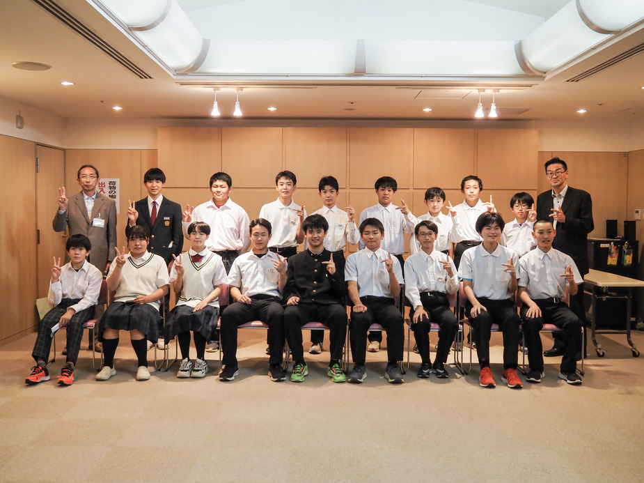 今回は男子バレーボール(芽中)、水泳(西中)、柔道(西中)、体操(西中)計18人が集まり、程野教育長に大会出場への意気込みを語りました。