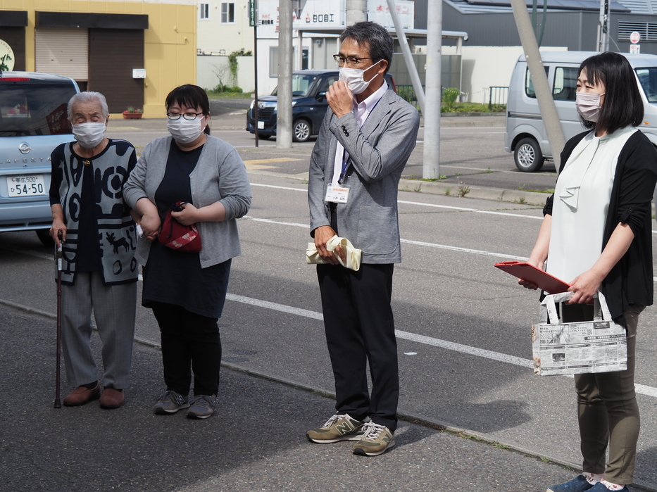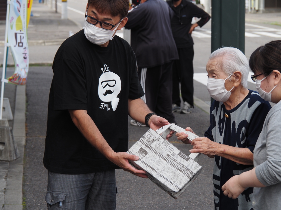 寄贈式会場(東1条3丁目18、フレッシュベーカリー旭屋商店前)では、利用者代表を代表し西本 富江(にしもと とみえ)さん(95歳!)から、みなくる商店会の武藤 健護会長にエコバッグが手渡されました。