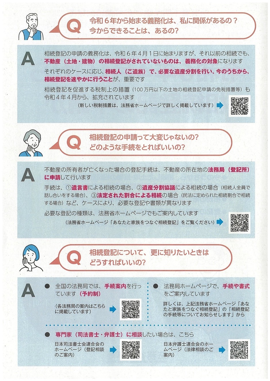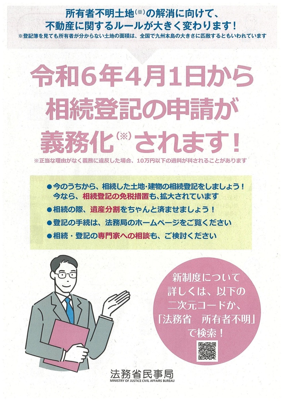 令和6年4月1日から相続登記の申請が義務化されます。相続登記は相続した自分の権利を保護するとともに、次の世代へ受け継ぐために重要なものです。また、相続登記手続を円滑に行うためには、遺産分割を速やかに進めることも重要です。