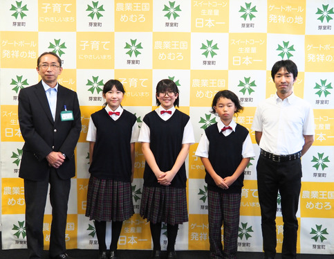 8月26日には、出場報告のため代表者3名が芽室町役場に来庁し、決意表明をしてくれました。程野教育長は「吹奏楽の字にあるように、楽しんでハーモニーを奏でてきてください」とエール。団長の井上真緒さんは「6年生最後のコンクールなので、悔いのない演奏をしてきます」と応えました。