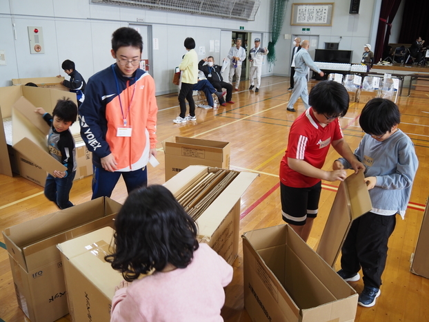 上美生小学校の体育館を避難所とし、心肺蘇生訓練や段ボールベッドづくりなどを体験。