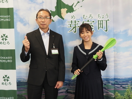 10月9日には、出場報告のため芽室町役場に来庁し、「自己ベストの50メートル以上を目指す」と決意を語りました。報告を受けた程野教育長は「植松さんは町民の誇りです。自己ベストのビッグスローに挑戦して」とエールを送りました。