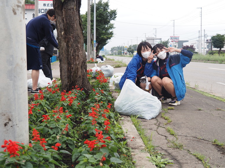 6月初旬に、多くの団体・企業や高校生の皆さんの手で植えられた国道沿いの花たち。このところの雨の多い天候のせいか、雑草も伸びてしまっている状態でしたが、白樺学園の高校生の有志の皆さん、先生たちが草取りに取り組まれました。