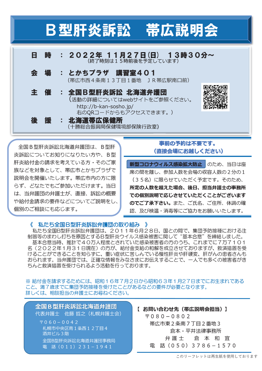 全国B型肝炎訴訟北海道弁護団は、B型肝炎訴訟についてお知りになりたい方や、B型肝炎給付金の請求を考えている方・そのご家族などを対象として、帯広市とかちプラザで説明会を開催いたします。帯広市内の方に限らず、どなたでもご参加いただけます。当日は、当弁護団の弁護士が、直接、訴訟の概要や給付金請求の要件などについてご説明をし、個別のご相談にも応じます。