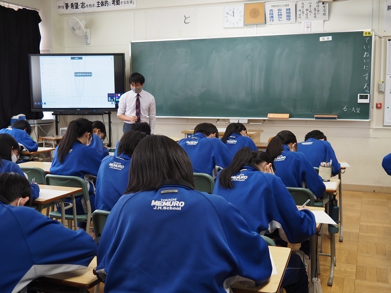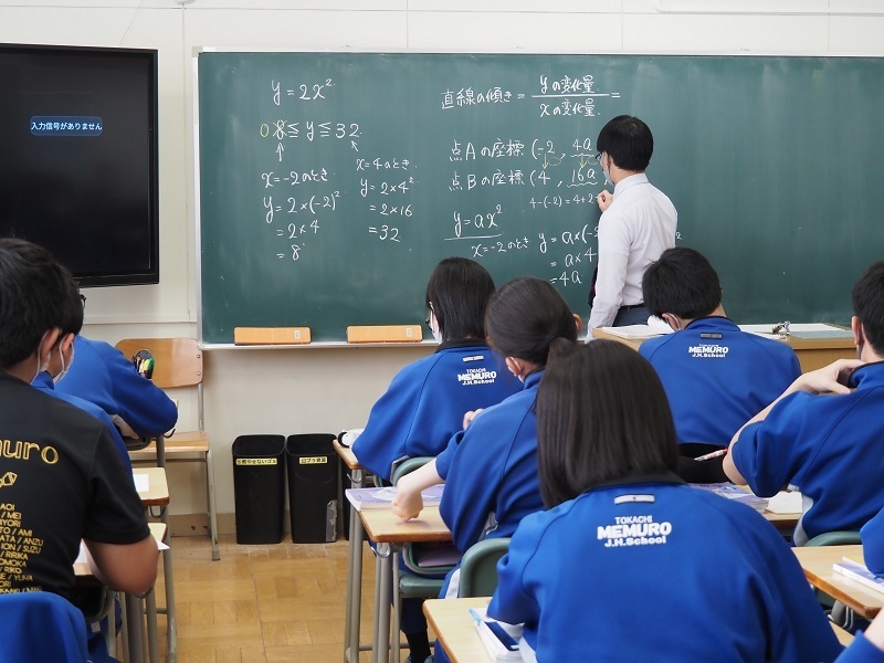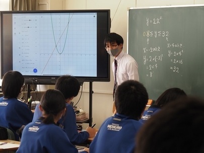また、コロナ禍で授業のデジタル化も大きく進んでおり、タブレットPCをデジタル黒板に映し出しながら、2次関数のグラフy=ax2(二乗)のaの値が変わればグラフの開きも変わっていく様子が視覚的に映し出されるなど、広報担当としては自分の時代を振り返り、おもわず「わかりやすくて、うらやましい」とうなずいてしまいました。