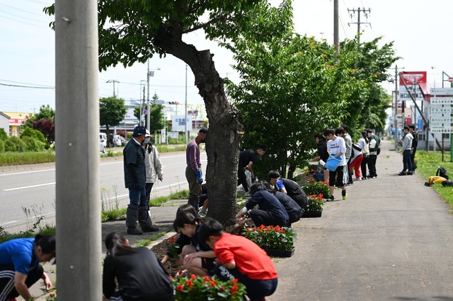 6月11日(日)、国道38号線沿いで植樹マスへの花植えが行われました。こちらは市街地町内会連合会主催のフラワータウン事業の一環で、例年、町内の様々な団体・企業の方々にご協力をいただいています。