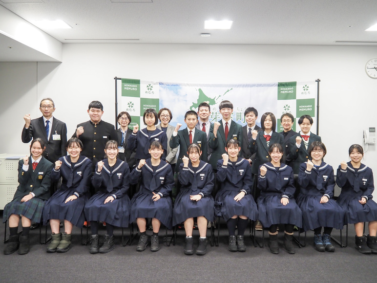 今回はソフトテニス(芽中)、バドミントン(芽中、西中)、スピードスケート(芽中、西中)、フィギュアスケート(西中)、スキー(芽中)と多くの種目で全道大会が決まっており、今回は15人が来庁しました。