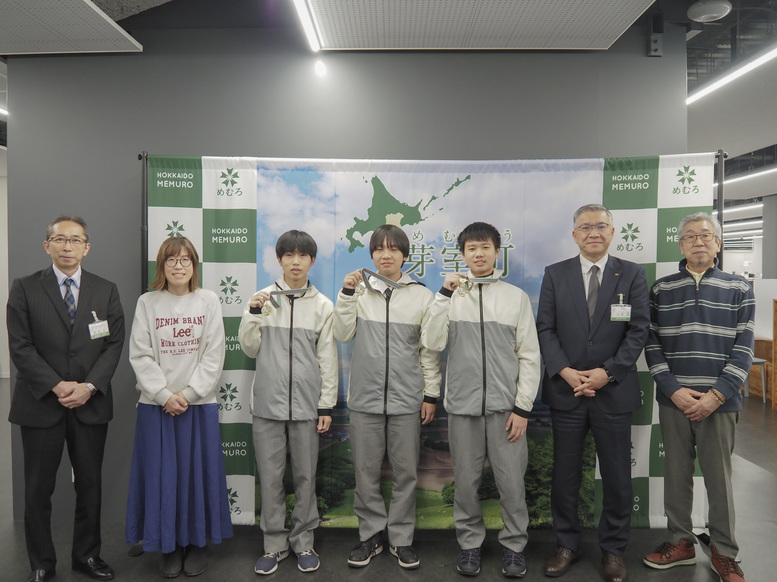 12月19日(火)には役場に来庁し、手島町長、程野教育長に全国大会の優勝を報告。各地から強豪が集まった今大会でしたが、6チーム中上位2チームが通過できる予選Aグループを1位で通過すると、勢いそのままに決勝リーグ4チームの中でも勝ちを重ねました。2位の開成高校(東京)や3位の作新学院(栃木)といった、芽室町発祥の地杯にも出場するほど競技が盛んなチームも参加した中でも「勝ちたい」と大会前から気合が入っていたようです。
