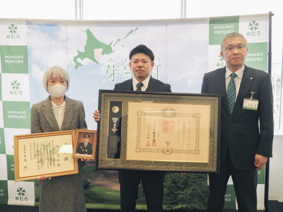 このたびの伝達式は昨年9月末に逝去されました熊谷 光弘さんの瑞宝双光章の受賞に対するもので、奥様の節子さん、長男の拓哉さんが来庁し、手島町長から勲章および町からの顕彰状が手渡されました。