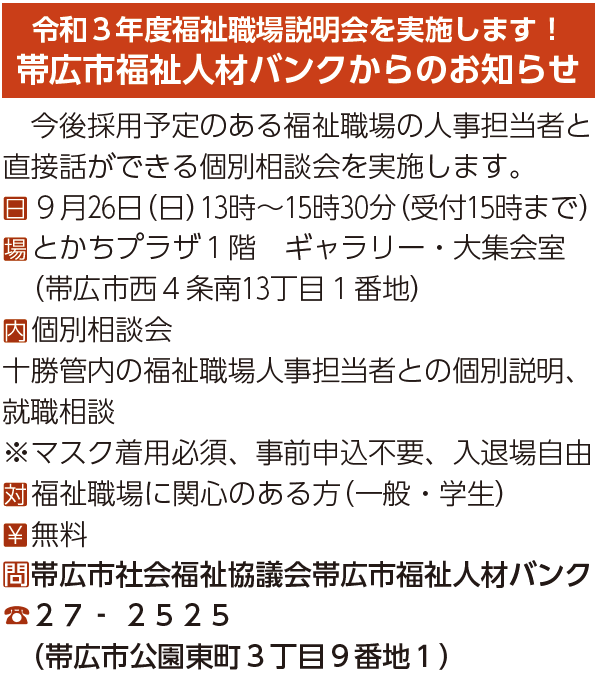 • 令和3年度福祉職場説明会を実施します!帯広市福祉人材バンクからのお知らせ