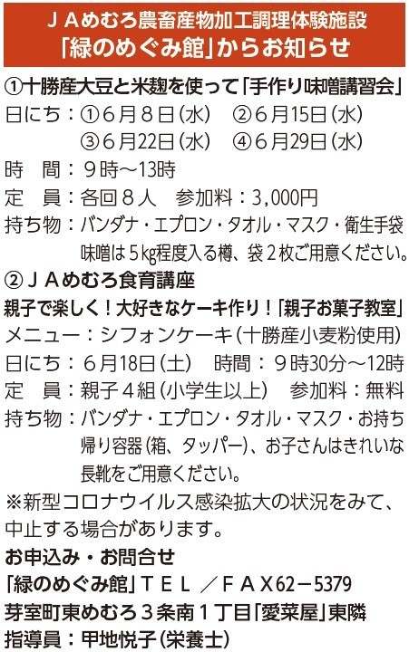 JAめむろ農畜産物加工調理体験施設「緑のめぐみ館」からのお知らせ