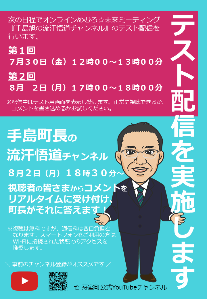 視聴者の皆さんが「コメント欄」に書き込んだ内容について、手島町長が答えます! ※インターネットへの接続環境がある方はパソコン、スマートフォンどちらからも視聴可能です。なお、コメントを書き込むためにはYouTubeアカウントを作成いただく必要があります。 |