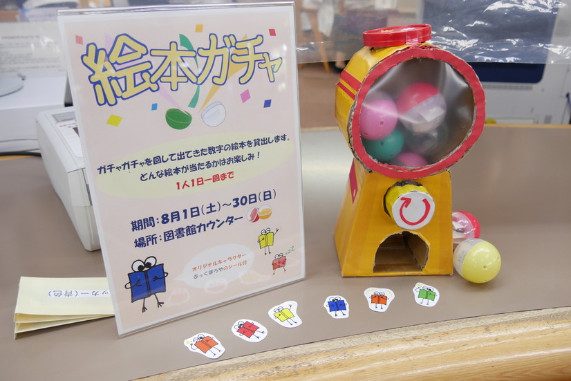 これは「ガチャガチャ」を回して、出てきた数字の絵本を貸し出す企画で、ガチャガチャの中には、番号札のほか、オリジナルキャラクター「ぶっくぼうや」のシールも入っています。