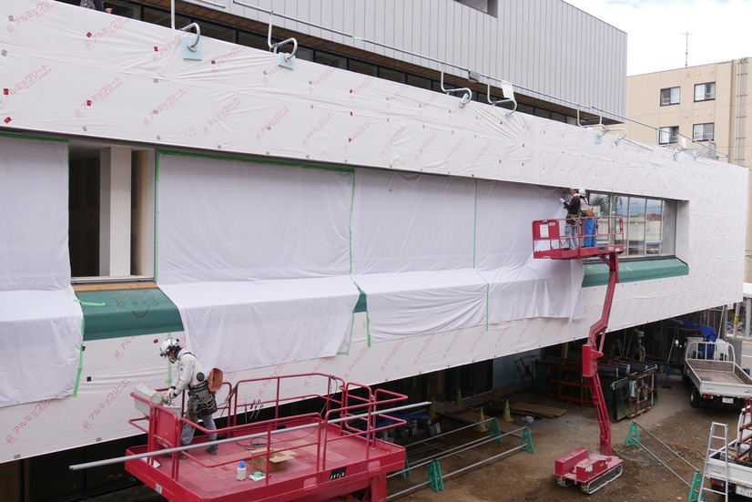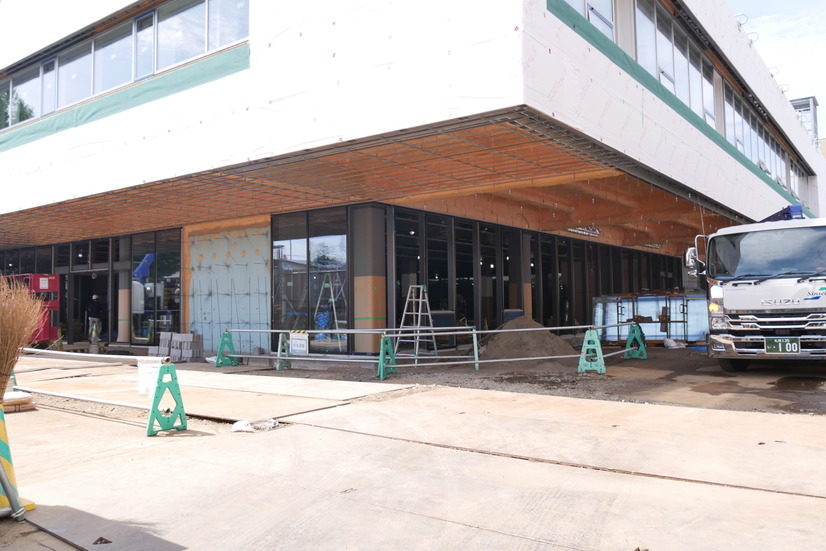 現在は内部の天井、外壁の一部板金箇所の施工中です。前回お届けしたエントランスの写真と比べ、外観に大きな変化はありませんが、内部工事は着実に進んでいるようです。