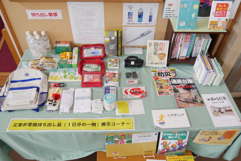 展示物は、関連書籍のほか、役場総務課地域安全係の佐藤防災士監修で、防災グッズの展示もあります。