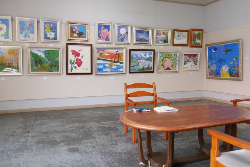現在、こちらで絵を学ぶ、炭谷京子さんの個展が開かれています。今回は油絵37点が展示されており、四季や行事など様々なシーンが色鮮やかに表現されています。