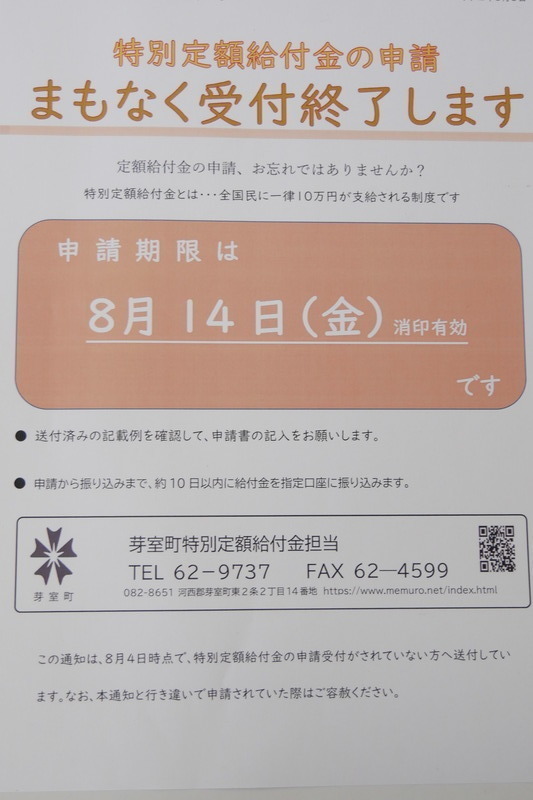 今日は特別定額給付金のチラシ写真です。全国民に一律10万円支給される特別定額給付金の申請はもうお済みですか?申請期限は8月14日(金)までです。申請忘れがないか今一度ご確認ください。また、今日は最高気温が34℃と高い予報ですので熱中症などに気をつけて、お過ごしてください。
