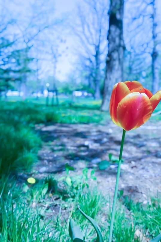 今日は芽室公園で撮影した一枚です。公園内や沿道では時おり単独で自生している植物を見かけることがあります。植えた覚えのない植物が自生することを「野良ばえ」というそうですが、このチューリップも風や動物の働きで種が運ばれ、野良ばえしたものと思われます。雑草の中でもしっかり花を咲かせているところを見ると、改めて植物の力強さを感じますね。