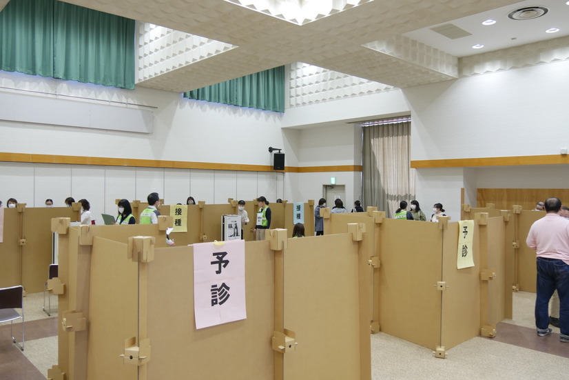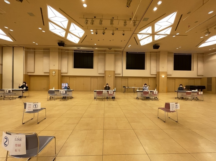 8日(土)、中央公民館講堂では、新型コロナウイルスワクチン接種の「集団接種」に向けたシミュレーションが、町、町内各医療機関の皆さまとの合同で行われました。スムーズな接種に向けて、導線の検討など様々な視点で検討が行われました。