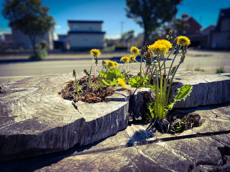 今日は総合体育館東側駐車場で撮影した一枚です。切り株が天然の植木鉢となり、そこからタンポポが生えています。春先は様々な植物が生えてくる光景が微笑ましい限りでしたが、今後は雑草がぐんぐん成長する時期となります。市街地でも花壇を整備されている方を見かけましたが、薬品や刃物を扱う際は安全に注意いただくようお願いします。
