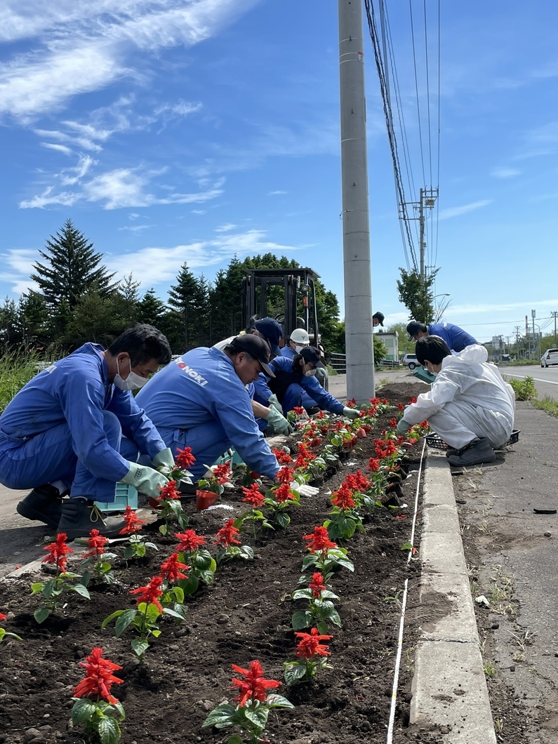 今日は、国道38号線沿いにお邪魔したところ、沿道企業の社員の皆さまが花を植えていらっしゃいました。