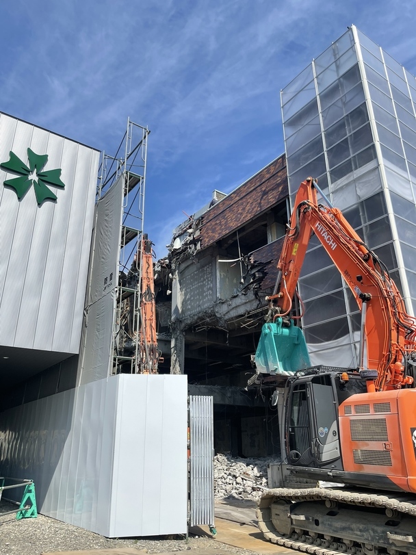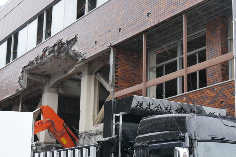3階部分まで解体作業が進んでいます。大きな重機でありながらも繊細な動きで丁寧な解体が進んでいます。