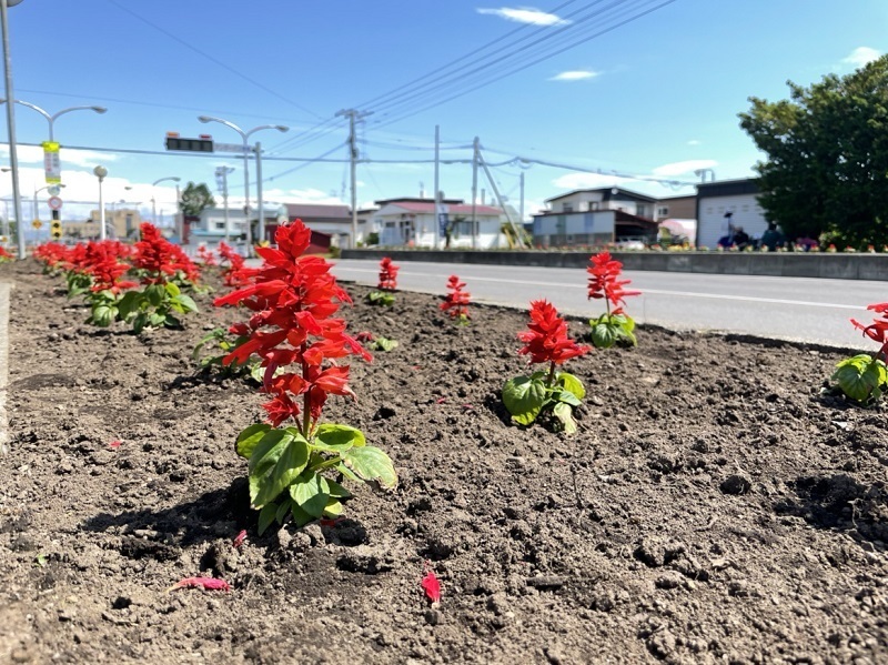 今日は、芽室小学校近くのアンダーパスをくぐった交差点の植樹桝にキレイに植えられたサルビアです。スッキリと澄み渡った青空に、可愛らしい赤が映えます。