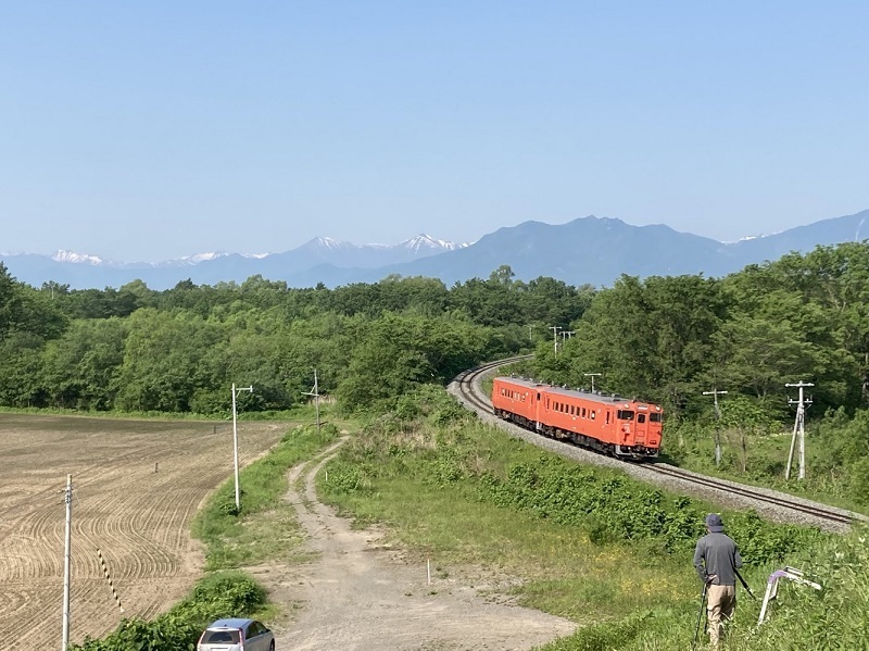 広大な日高山脈を背景に深い緑の木々の中、曲線を描く鉄路と赤い車両とのコントラスト。鉄道好きの皆さんにとってはリピーターとなるほどの絶景だそうです。