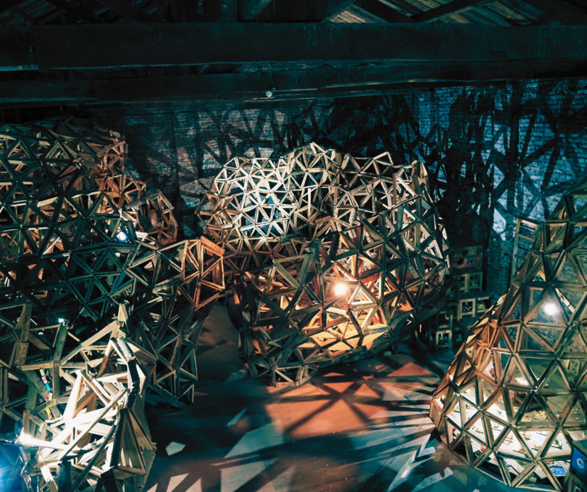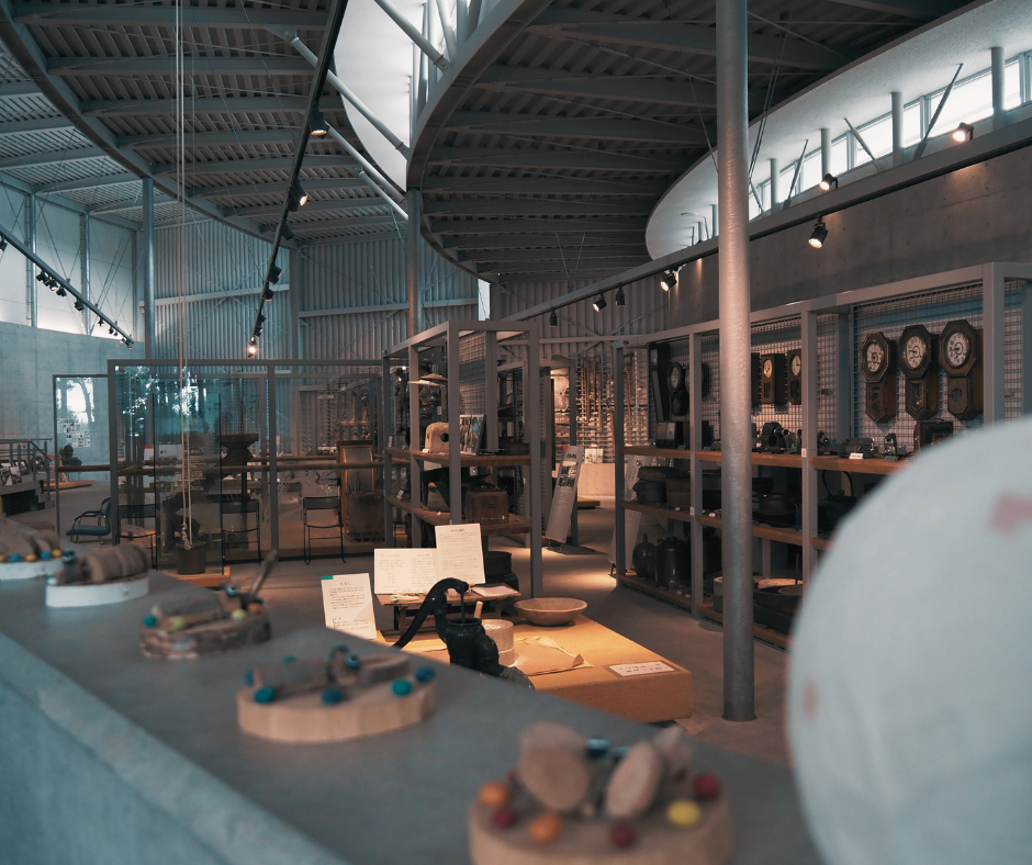 特徴的な球形のオブジェはカラマツの廃材が利用されており、作品群には異文化共生や世界平和への想いが込められているそうです。