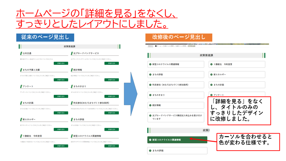 具体的には、各見出しのページにこれまでついていた「詳細を見る」という緑色のボタンをなくし、タイトルのみの表示に改めました。パソコンの場合はマウスのカーソルを見たいタイトルに合わせると色が変わるようになっています。