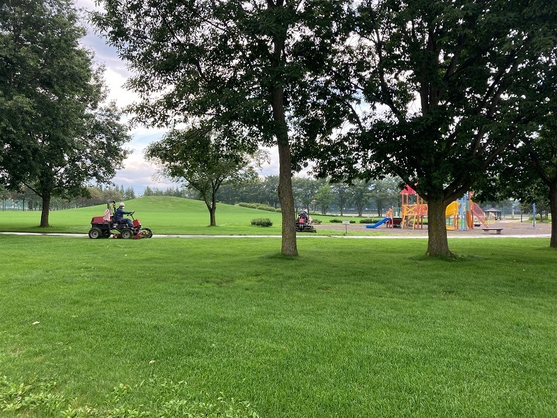 朝から2人の作業員の方が、自走式の芝刈り機に乗り器用に広大な面積の芝の手入れを行っていました。芝刈りは、週に1回程度10月上旬くらいまで続き、奥に見える小山も含めて2人で2時間程度かけて綺麗に仕上げているとのことでした。