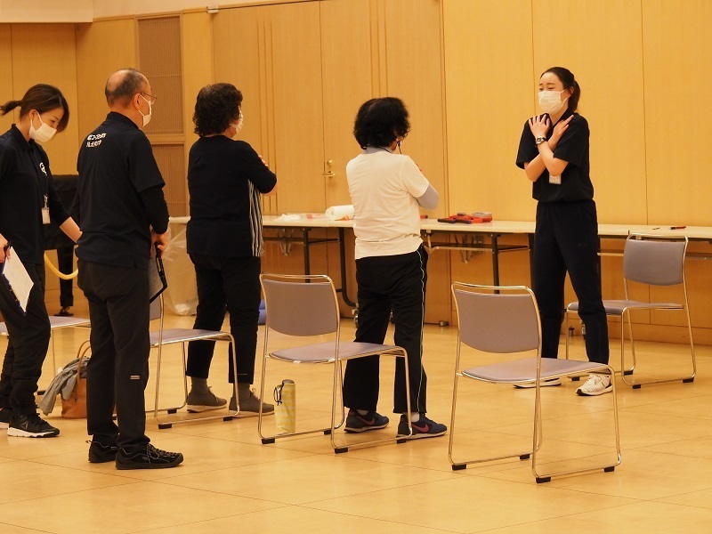 2日間で予定定員を上回る申し込みがあり、65歳から89歳までの119人の皆さんが7つのグループに分かれ、それぞれ割り当てられた時間に集合し、10m全力歩行や握力測定、頭の元気チェック(脳トレ)などの測定を行っていきます。