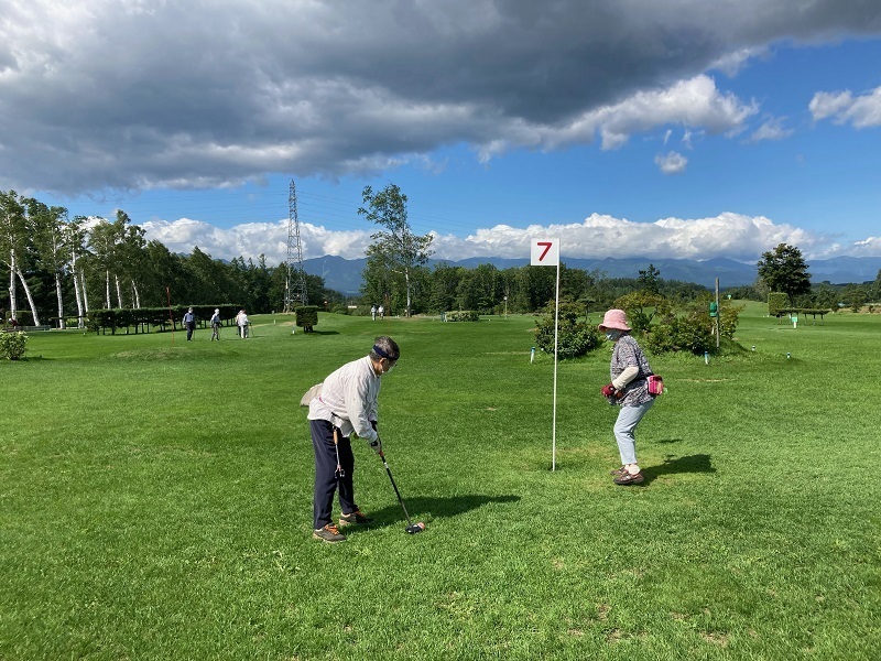 今日も、ご夫婦や友達連れの方の少数グループがマスク着用等の感染対策をしたうえで青空のもと気持ち良さそうにプレーしていました。お話を伺った方は、毎日のパークゴルフが日課で腰痛も改善されているとのこと。