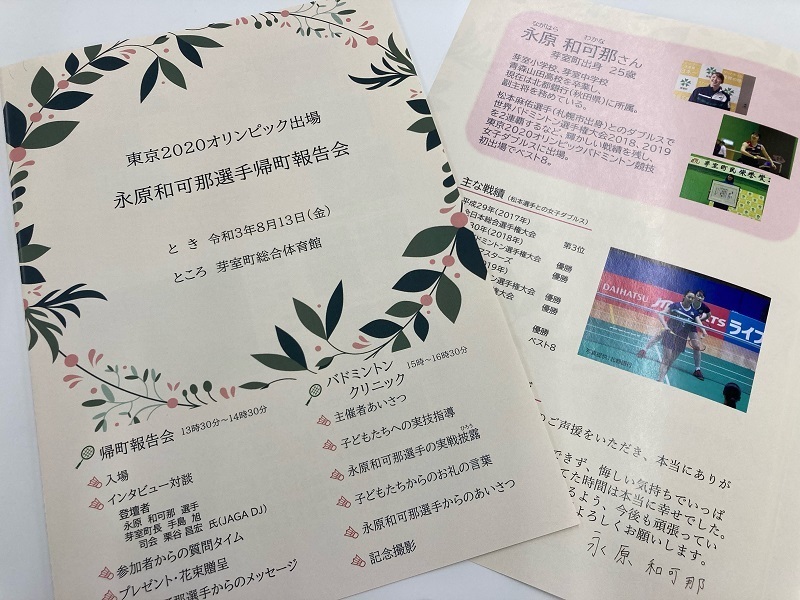 コロナ感染拡大防止のため、事前に申し込みのあった町民を限定しての開催となりますが、オリンピックという大舞台で戦ってきた永原選手の功績を称え、感動をありがとうの気持ちをお伝えできる場となればと思っています。