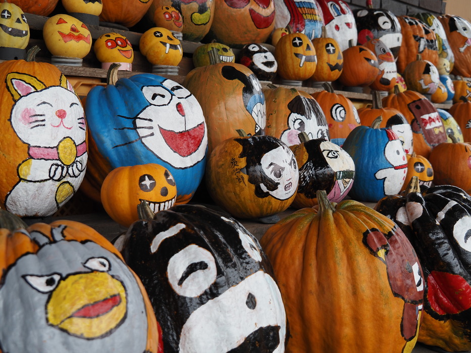 この作品はこちらの家の方が毎年作成しているもので、自家栽培のカボチャに様々なキャラクターを描いて家の前に展示しています。すでに過去の広報や新聞でも複数回紹介され、毎年の風物詩となっている光景ですが、今年は作品数が大幅に増えています。